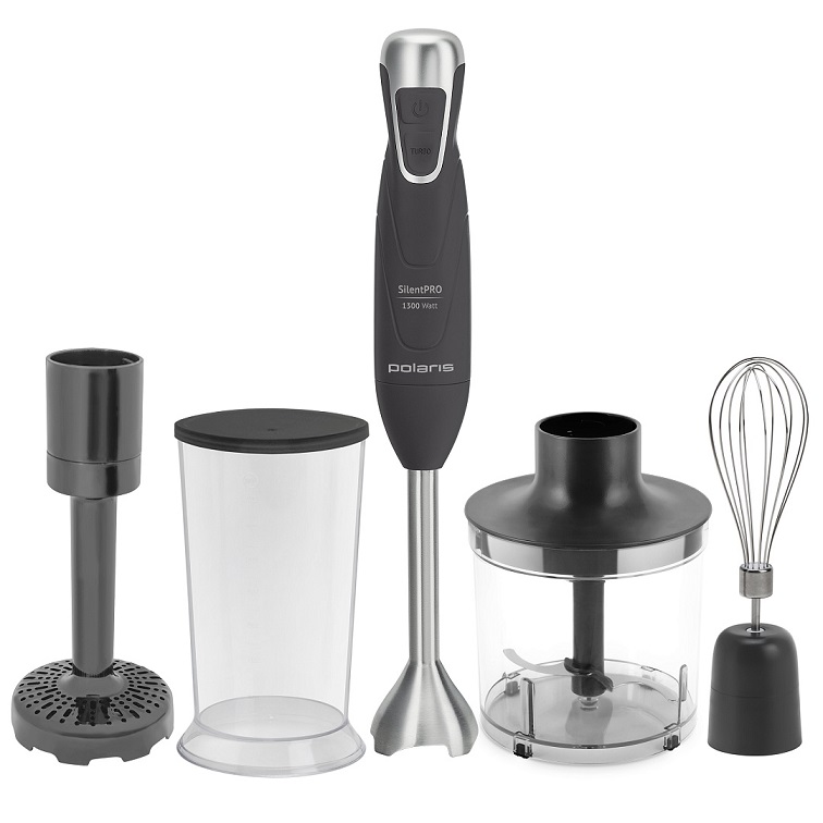 Технология SilentPRO. Технология PROtect+ - это защита двигателя от перегрева и перегрузки. Мощность 1300 Вт. Четырехлепестковый нож из нержавеющей стали. Две скорости + турборежим. В комплекте: венчик, измельчитель объемом 0,5 л, мерный стакан объемом 0,7 л, насадка для пюре.