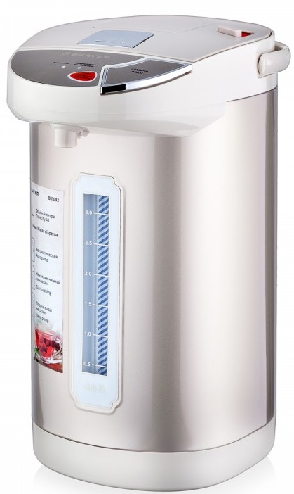 Мощность 900 Вт. Объем 4 л. Корпус и колба из нержавеющей стали. Три способа подачи воды: автоматический, нажатием чашкой на клапан, ручная помпа. Функция поддержания температуры воды. Функция повторного кипячения. Шкала уровня воды. Крышка с фиксатором. Удобная ручка для переноски. Автоотключение при отсутствии воды. Поворачивающийся на 360° корпус.