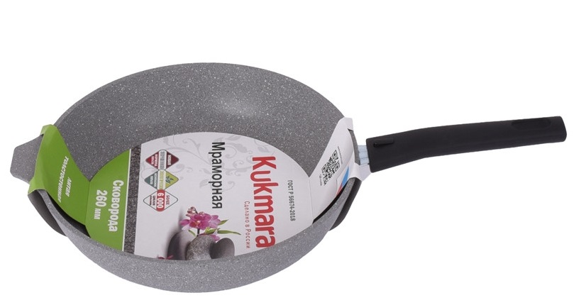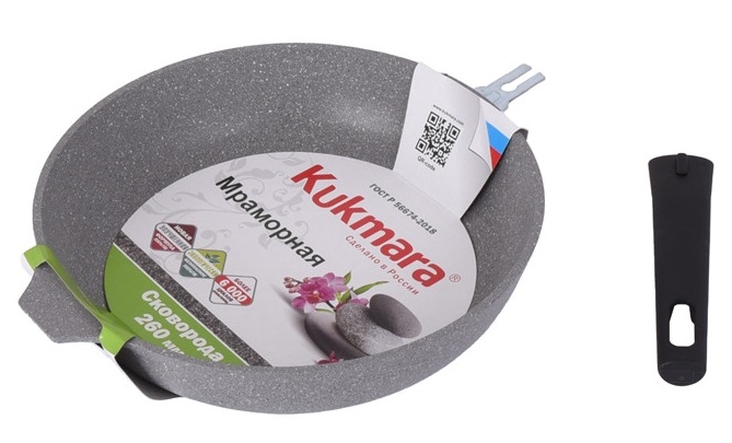 Диаметр 26 см. Съемная ручка. Внешнее термостойкое покрытие. Внутреннее антипригарное мраморное покрытие, усиленное частицами минералов. Высота бортов 6 см. Можно использовать в духовке. Можно мыть в посудомоечной машине. Подходит для всех видов плит, кроме индукции.
