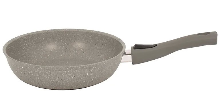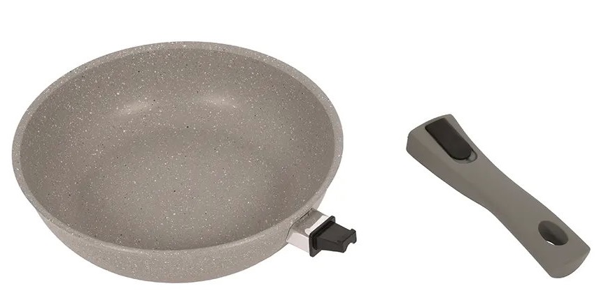 Диаметр 24 см. Съемная ручка. Внешнее термостойкое покрытие. Внутреннее антипригарное мраморное покрытие, усиленное частицами минералов. Высота бортов 6 см. Можно использовать в духовке. Можно мыть в посудомоечной машине. Подходит для всех видов плит, кроме индукции.