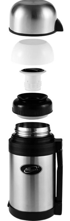 Универсальный термос выполняет функции термоса для еды (первого или второго) или термоса для напитков. Объем 1 л. Высота 23 см, диаметр 10,6 см. Вес 780 гр.
