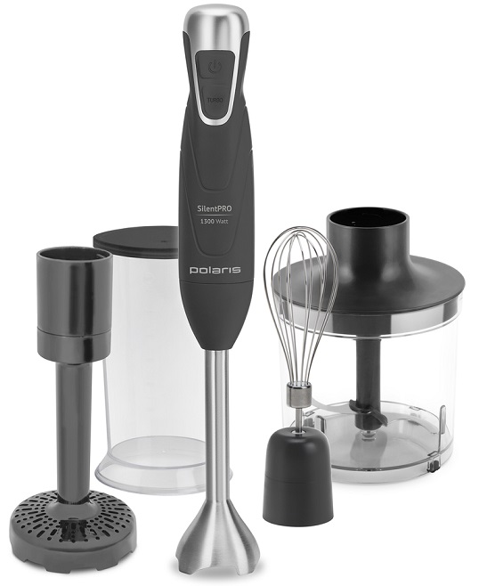 Мощность 1300 Вт. Две скорости с плавной регулировкой. Насадка блендера из нержавеющей стали. В комплекте: измельчитель объемом 0,5 л, насадка для пюре, мерный стакан с крышкой объемом 0,7 л, венчик.