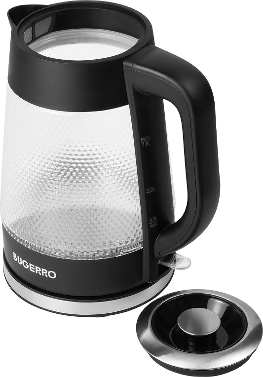 Мощность 2100 Вт. Объем 1,8 л. Стеклянный корпус. Дисковый нагревательный элемент. Съемный фильтр. Вращение на 360˚. Шкала уровня воды. Внутренняя подсветка. Защита от перегрева и включения без воды. Автоотключение при закипании.