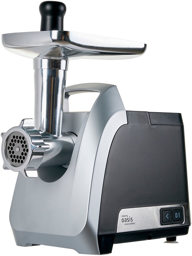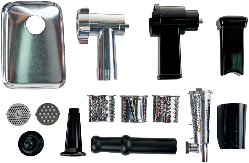 Мощность 2000 Вт. Производительность 2,5 кг/мин. Реверс. В комплекте: три диска для фарша с отверстиями 3 мм, 5 и 7 мм, насадка для кеббе и колбас, три барабана для нарезки овощей, насадка-соковыжималка. Самозатачивающийся нож. Защита от перегрева. Прорезиненные ножки.