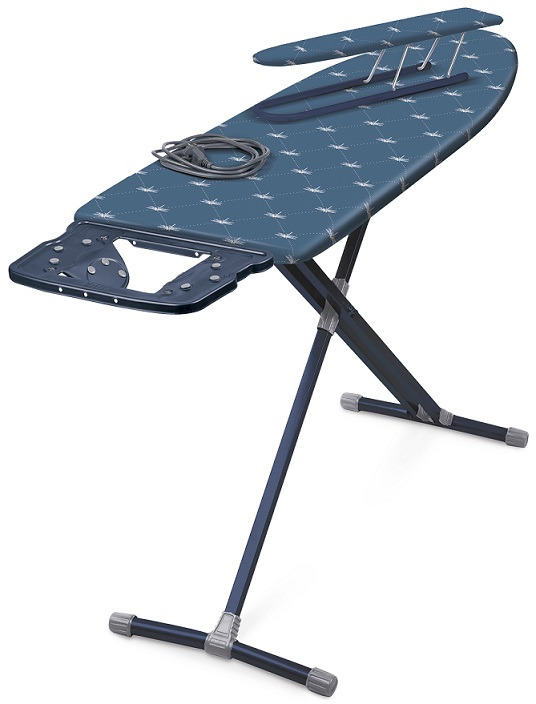 Гладильная доска с электроудлинителем. Регулируется по высоте до 90 см. Размер рабочей поверхности 122 х 40 см. Рабочая поверхность металлическая с отверстиями для пара. Съёмный чехол из хлопка с термоустойчивым покрытием. Подставка под утюг с термовставками. Переносной подрукавник. Устойчивые опоры с пластиковыми наконечниками для защиты. Фиксация в сложенном виде. Максимальная нагрузка на гладильную поверхность - 25 кг.