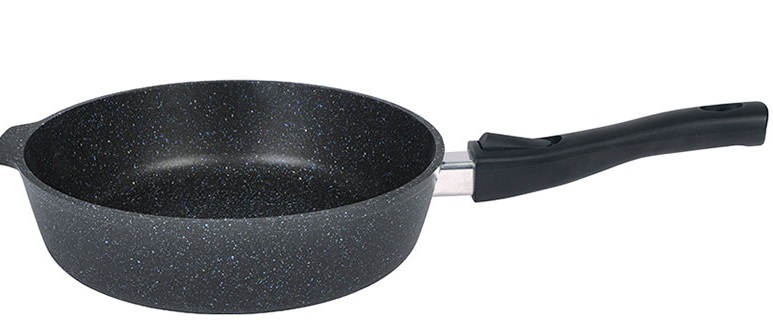 Диаметр 28 см. Из литого алюминия. Съемная бакелитовая ручка. Толщина дна 6 мм. Внутреннее антипригарное покрытие. Можно использовать в духовке, мыть в посудомоечной машине. Подходит для всех типов плит, кроме индукции.