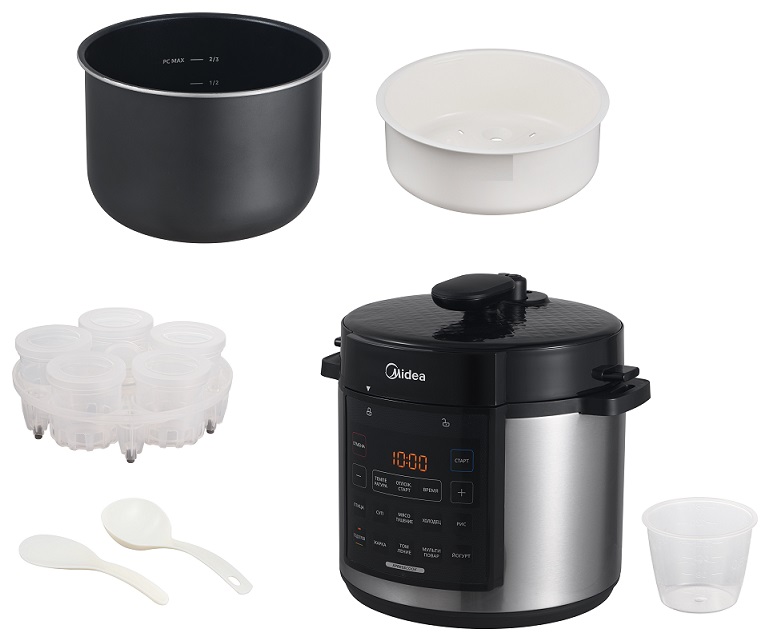 Мощность 1000 Вт. Электронное управление. Программы: жарка, тушение, суп, йогурт, рис, томление, птица, холодец, мясо, мультиповар. Объем чаши с антипригарным покрытием 6 л. Поддержание температуры. Таймер до 24 ч. Разогрев блюд. В комплекте: стаканчики для йогурта, пароварка.